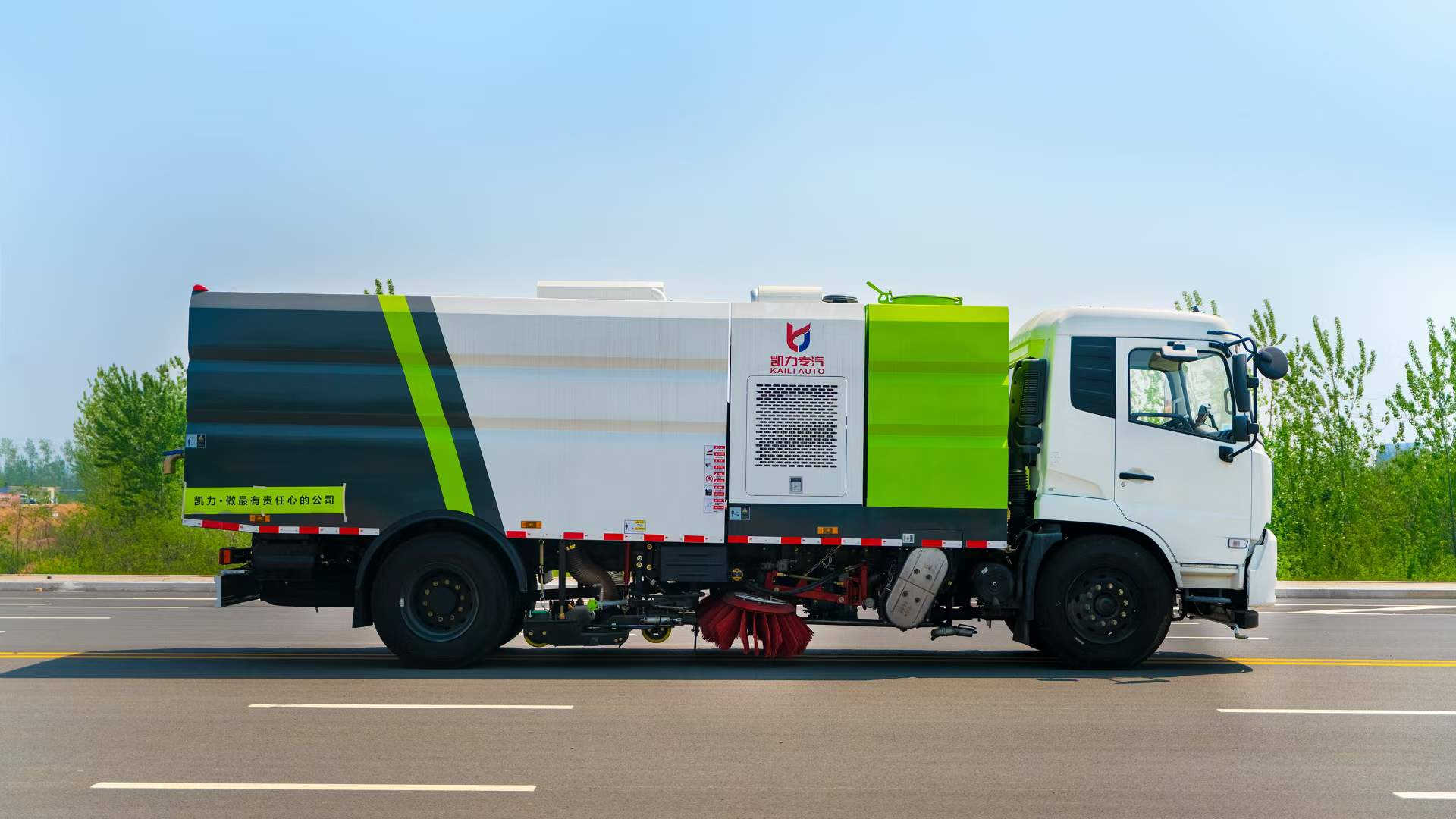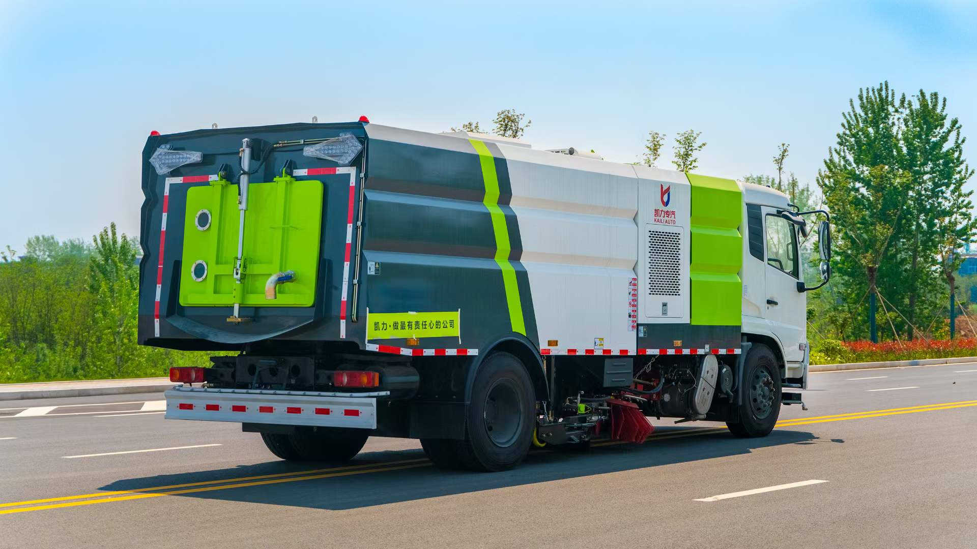 底盤電池提供動力,永磁同步電機驅動,可根據需要實時調速,取力操作與底盤行駛系統無任何關聯,用車體驗感極佳。中置2掃盤,三洋馬達,GTM高壓水泵,皖液齒輪泵,海普瑞斯液壓油缸,萬向高壓路沿清洗,免維護離心式風機,不銹鋼水箱、垃圾箱,不銹鋼高壓管路、施耐德控制開關、美國傳感器、尾部LED箭頭燈;垃圾箱、水箱均帶防溢或低水位報警裝置,倒車及洗掃狀態室內監控系統,尾部帶電控操作系統,15M高壓沖洗卷盤,最大清掃寬度3.5m,高壓沖洗21m。 電氣系統由底盤車電路專用工作裝置操作控制電路組成。